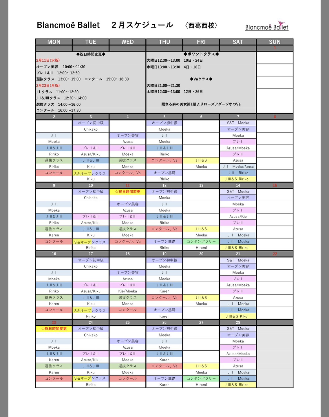 ※西葛西校JⅡ〜Sクラスのヴァリエーションクラスは発表会練習のためお休みとなります。