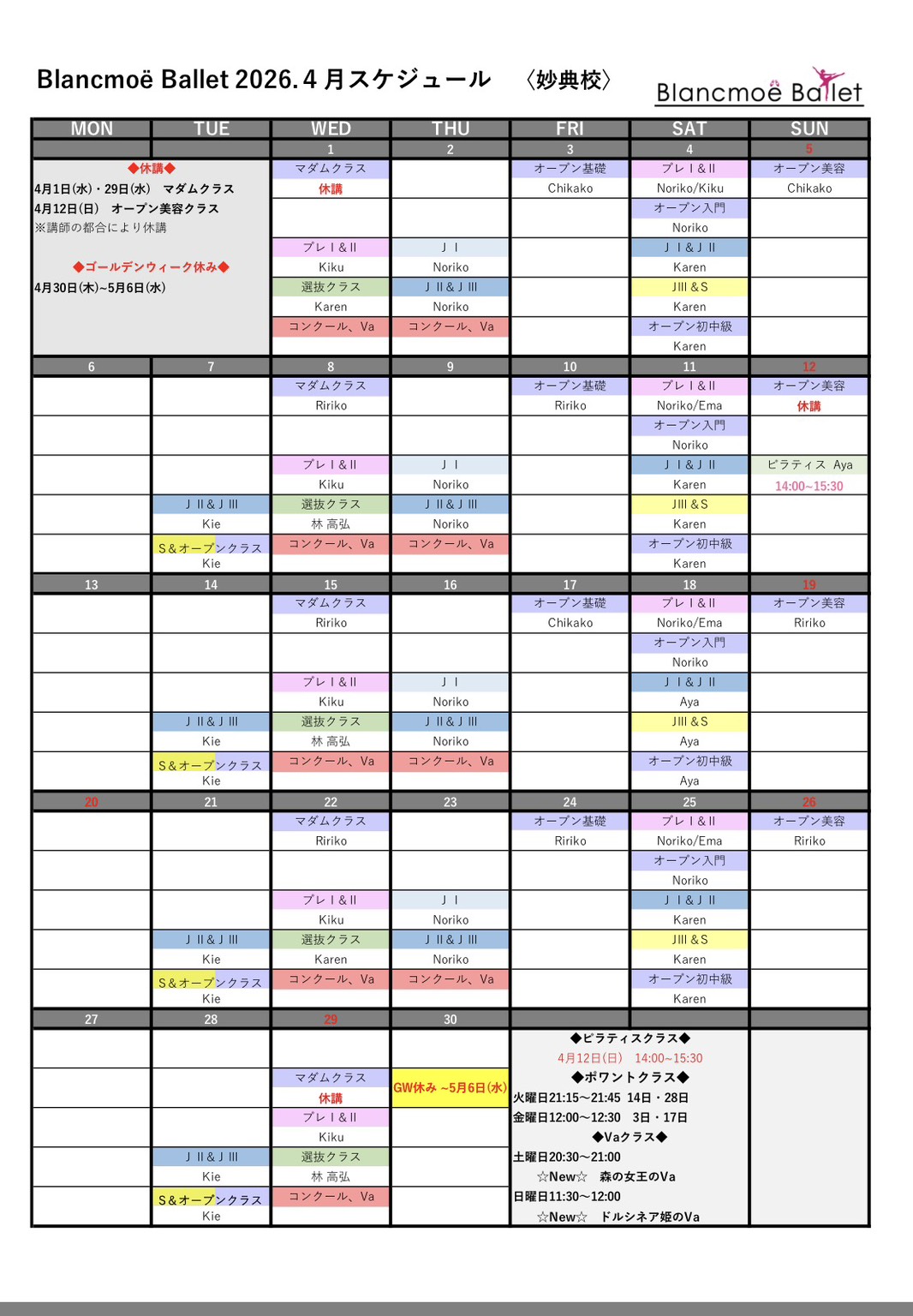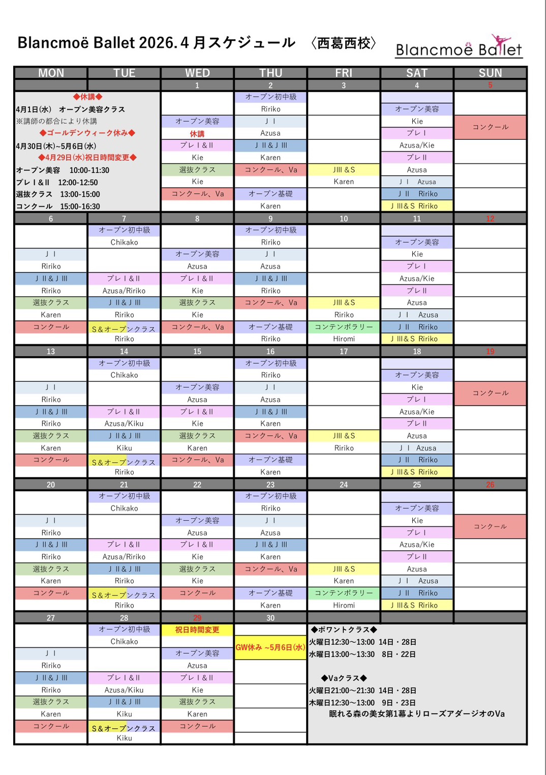 ※西葛西校JⅡ〜Sクラスのヴァリエーションクラスは発表会練習のためお休みとなります。